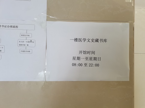 图书馆一楼医学馆门口粘贴了关于图书馆楼层索引和开馆时间的内容,以便同学们自助浏览及了解。