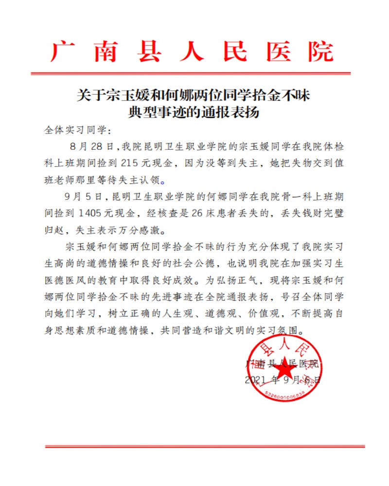 广南县人民医院对我院宗玉媛和何娜两位实习生拾金不昧的典型事迹进行了全院通报表扬