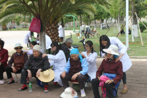 (图一:活动现场医疗部的部长在给老人们测血压)